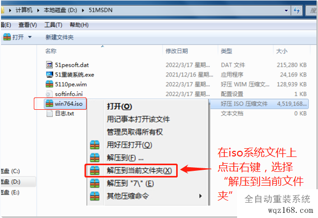温馨提示:您可以将下载的ISO系统镜像拷贝至任意电脑使用,有网没网都可安装。在ISO系统镜像文件上点右键,选中解压到当前文件夹选项,比如系统镜像win7_64.iso,如图: